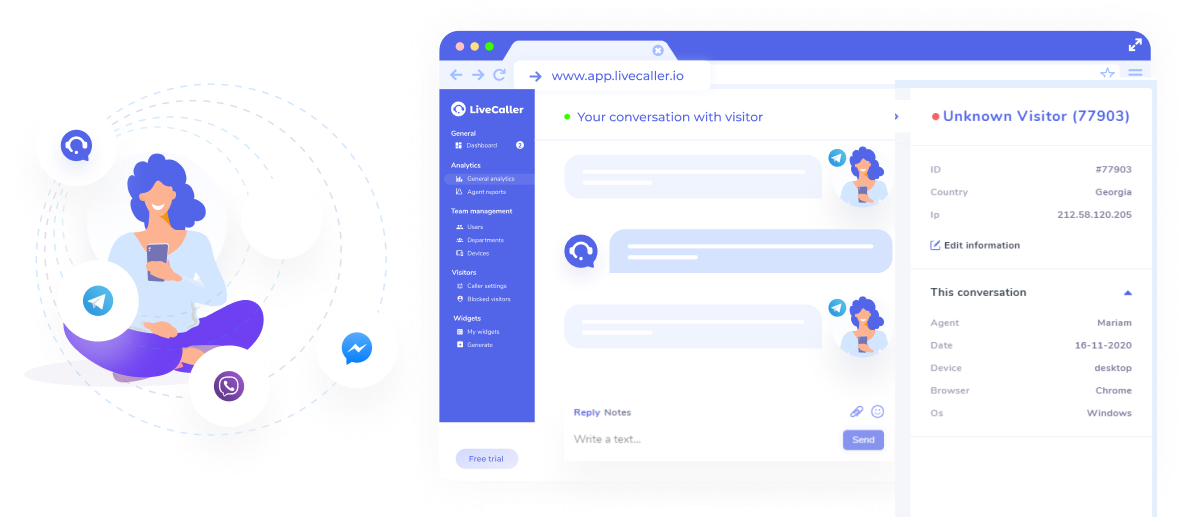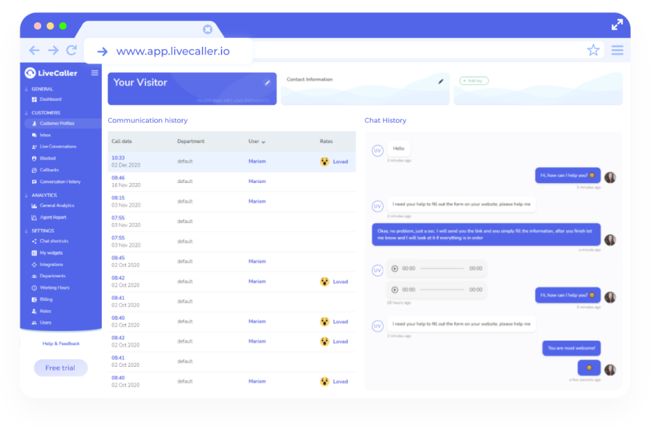 Use the chatbot to monitor customer questions and behavior, optimize responses, and pinpoint cases needing operator support. LiveCaller helps you leverage data to continually improve service and boost satisfaction.